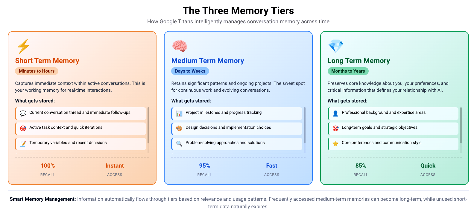 What makes Titans genuinely innovative is how closely its memory architecture mirrors biological cognition. Human brains don't store everything uniformly. We have working memory for immediate tasks, short term memory for recent events, and long term memory for consolidated knowledge. Titans implements a similar three tier system.