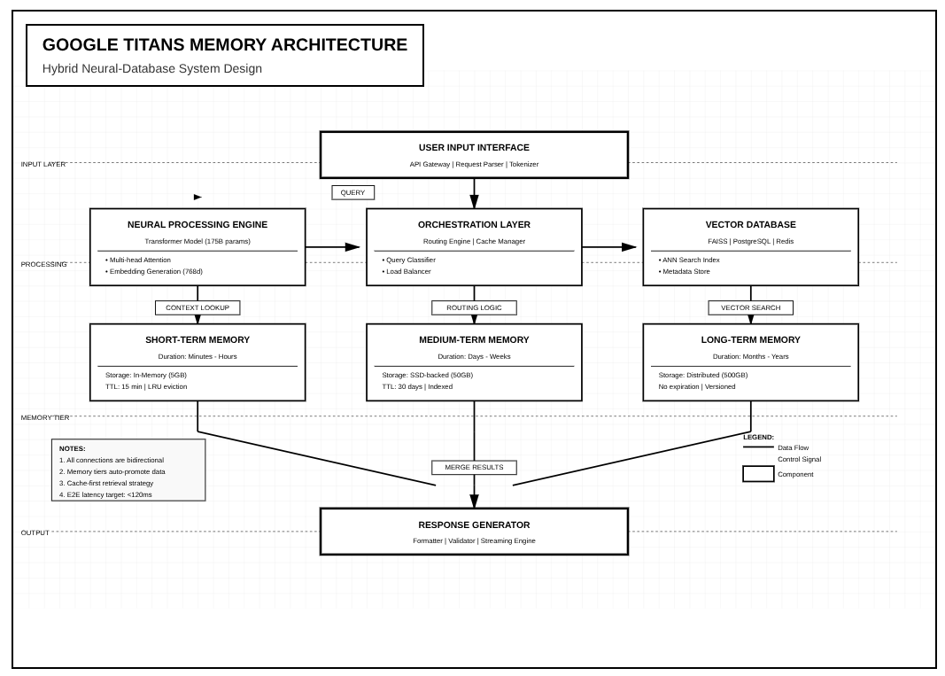 Here's what most coverage misses entirely. Titans isn't just a bigger transformer. It's a hybrid architecture that combines neural networks with structured databases. Behind the conversational interface sits what Google calls a persistent context store. This external memory system uses vector databases to maintain embeddings of past conversations indexed for rapid retrieval.