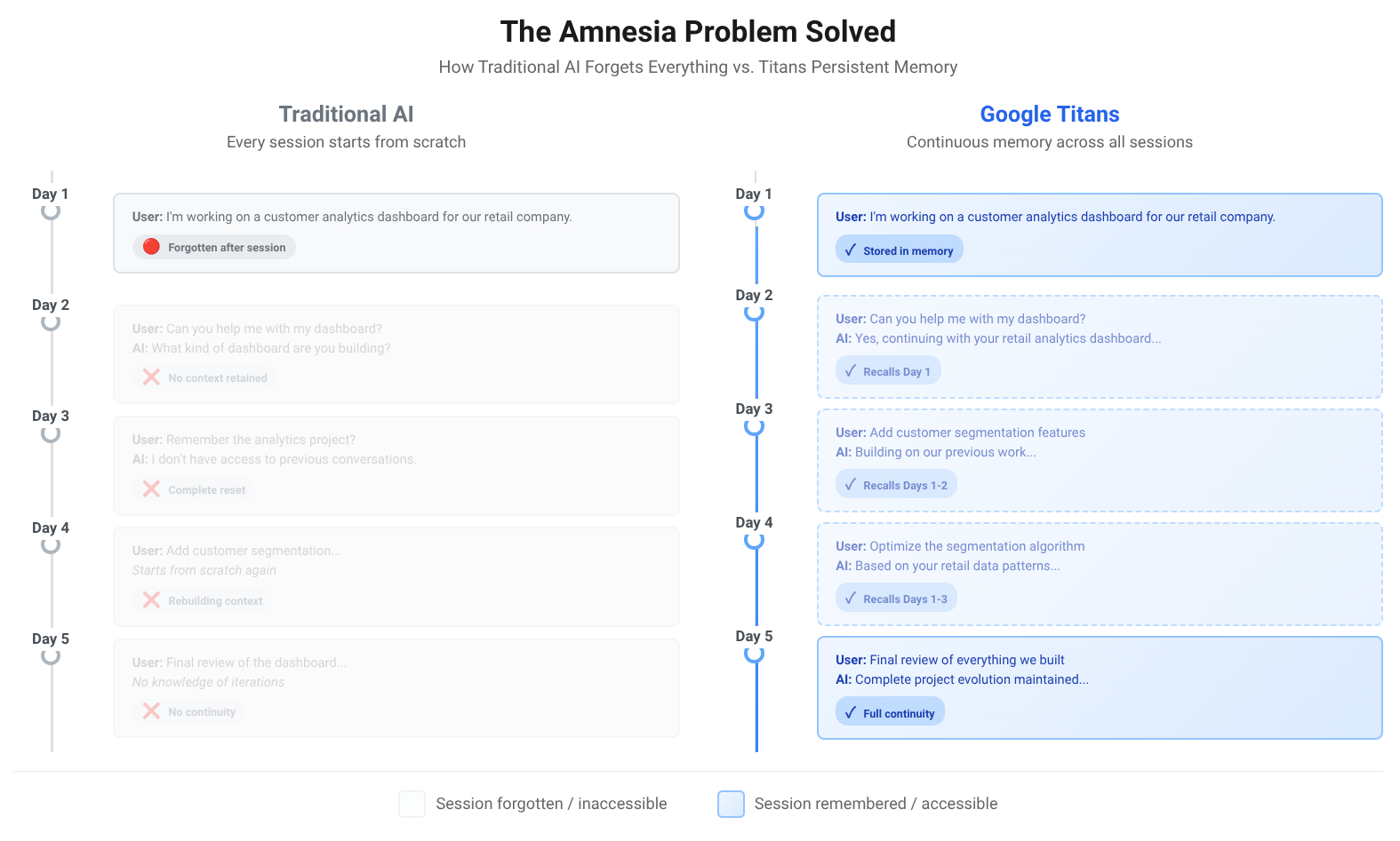 For context, consider what amnesia costs us in human relationships. Someone who can't remember you isn't really your friend, your doctor, or colleague. They're a stranger who happens to be helpful in the moment. Every AI system until now operated under this limitation. Titans represents the first serious attempt at permanence in machine intelligence.